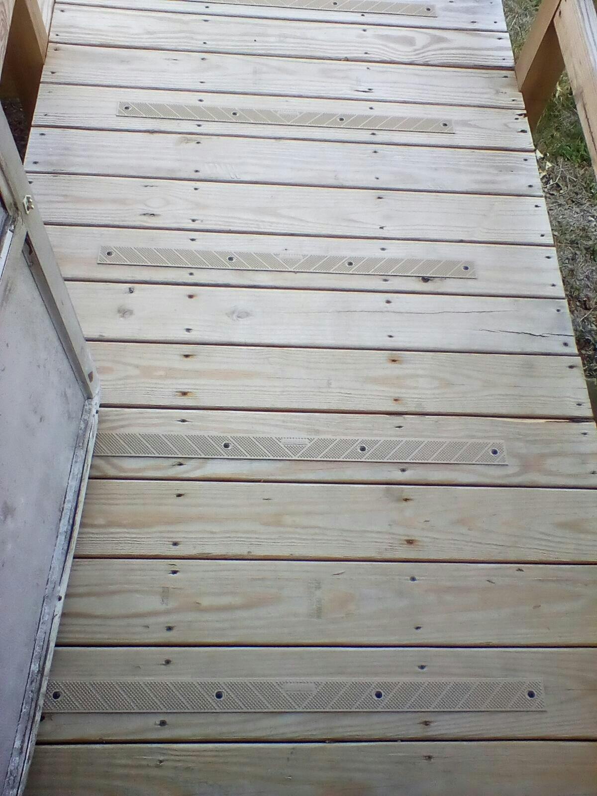 GripStrip are made of plastic and not an adhesive product but rather adhere to wood or other surfaces using provided screws. GripStrip are ideal for porches, separate entry stairs, deck, docks, ramps, scaffolding, boardwalks and more and may help prevent slips and falls by providing safer footing. *May be too aggressive for bare feet barefoot version available